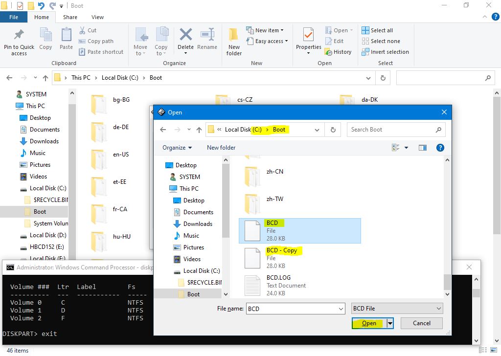 Se face boot in HBCD PE x64 si cu diskpart se identifica partitiile, apoi se repara BCD-ul cu BootIce in profesional mode