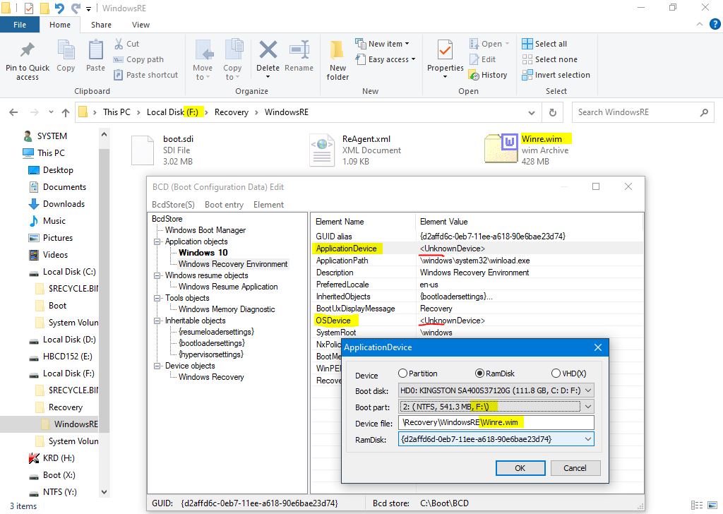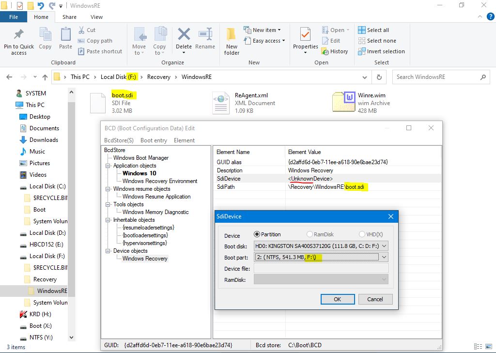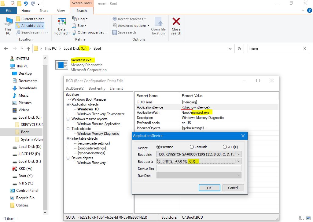 Se corecteaza {bootmgr} si {memdiag} la device din Unknown in C: (litera partitie de boot)
