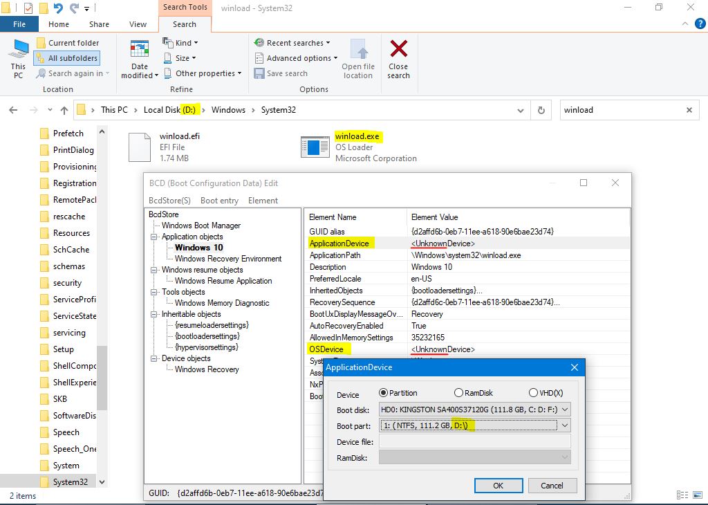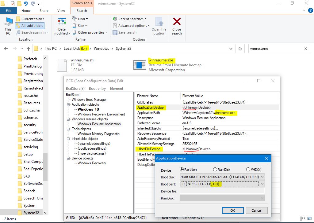 Se corecteaza meniul de windows si cel de resume la device si osdevice din Unknown in D: (litera partitie de windows)