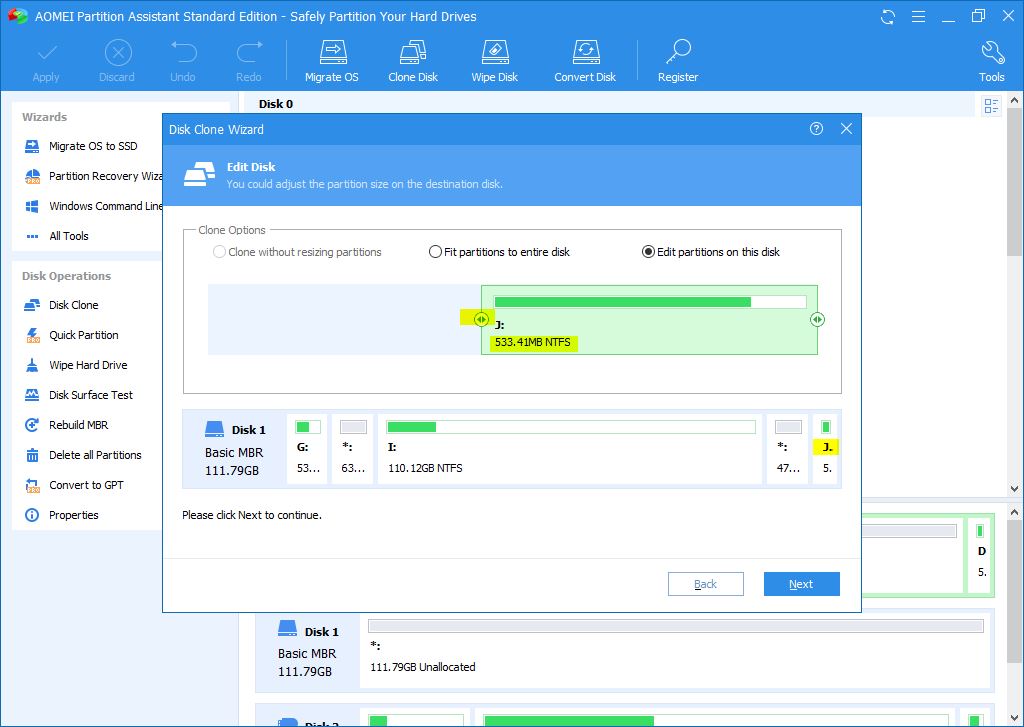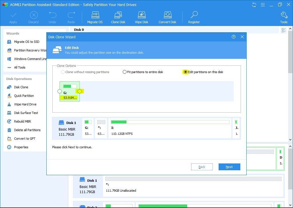 Se selecteaza edit si partitia 1 se micsoreaza: se trage latura dreapta spre stanga pana se obtine putin peste 50mb