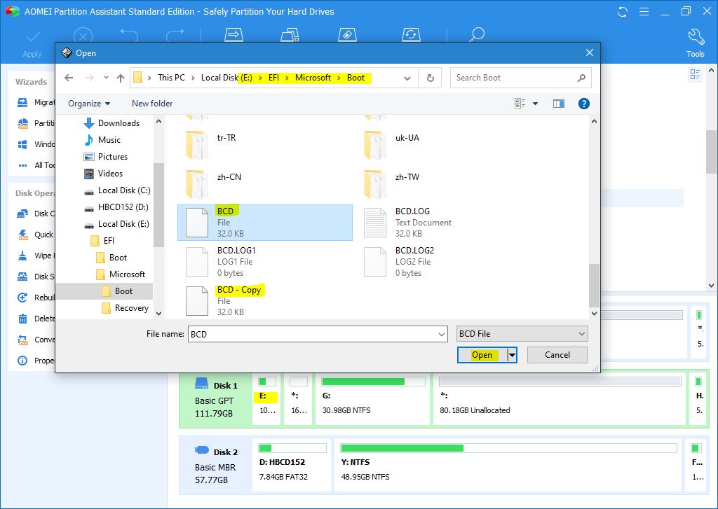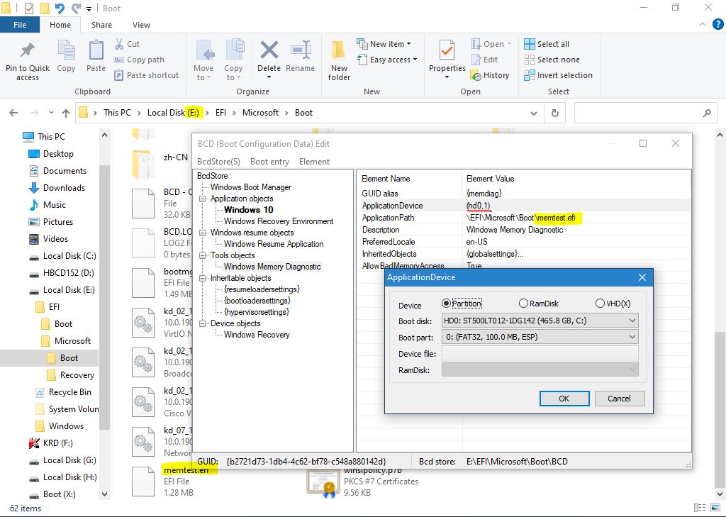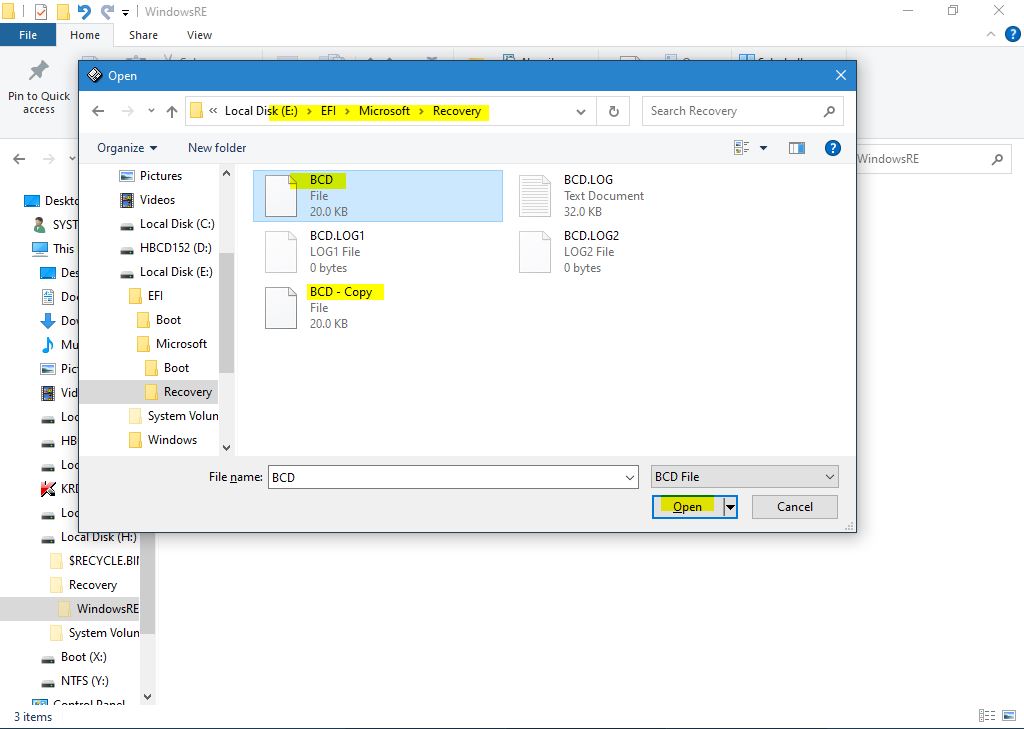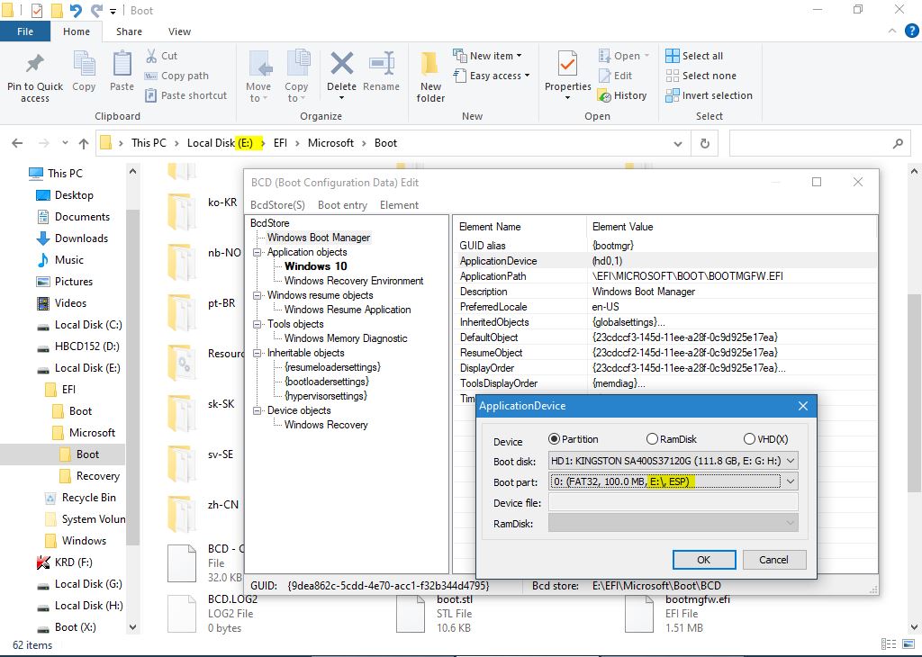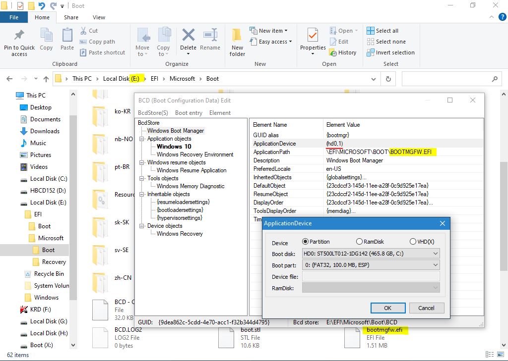 BCD-ul default in e partitia de boot in E:\EFI\Microsoft\Boot, inainte de a da Open se face backup cu Ctrl+c si Ctrl+v