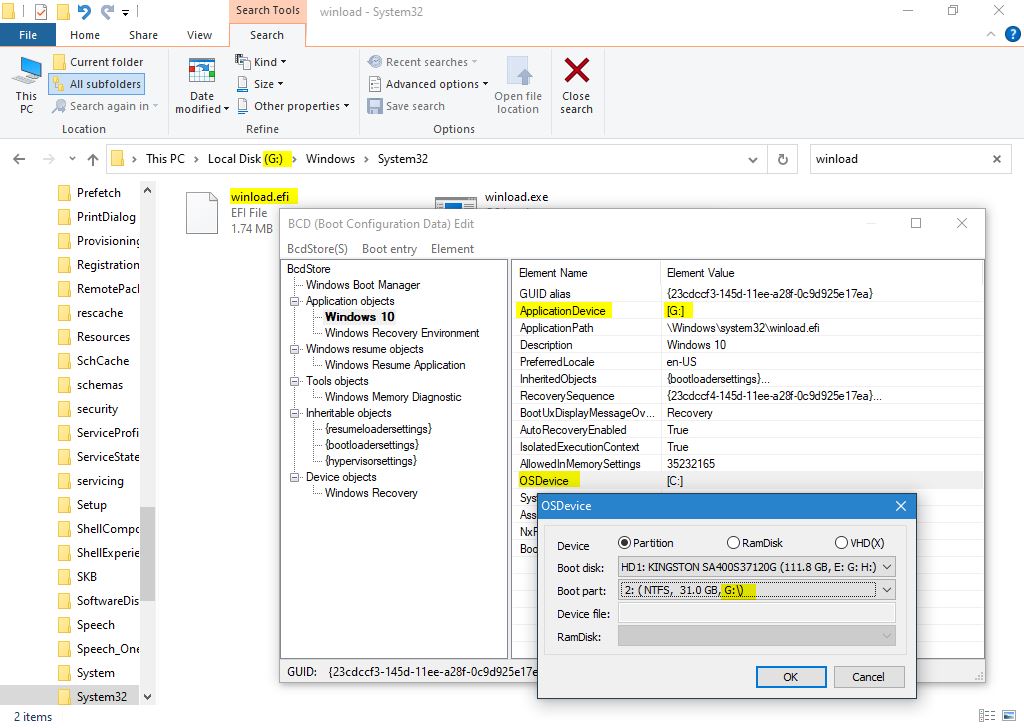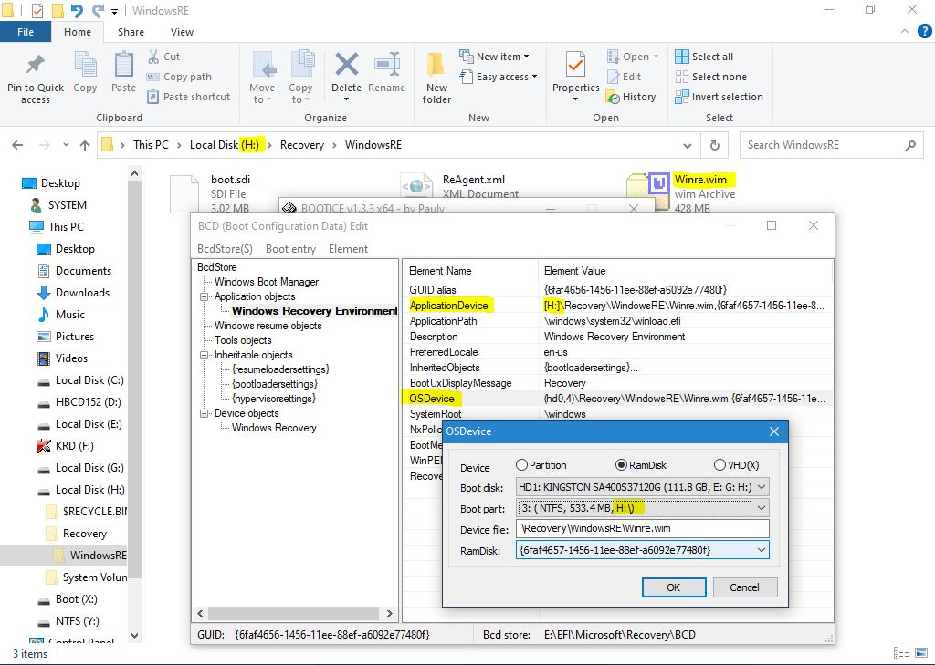 Se modifica windows recovery la device si osdevice in litera paritiei de recovery disk 1