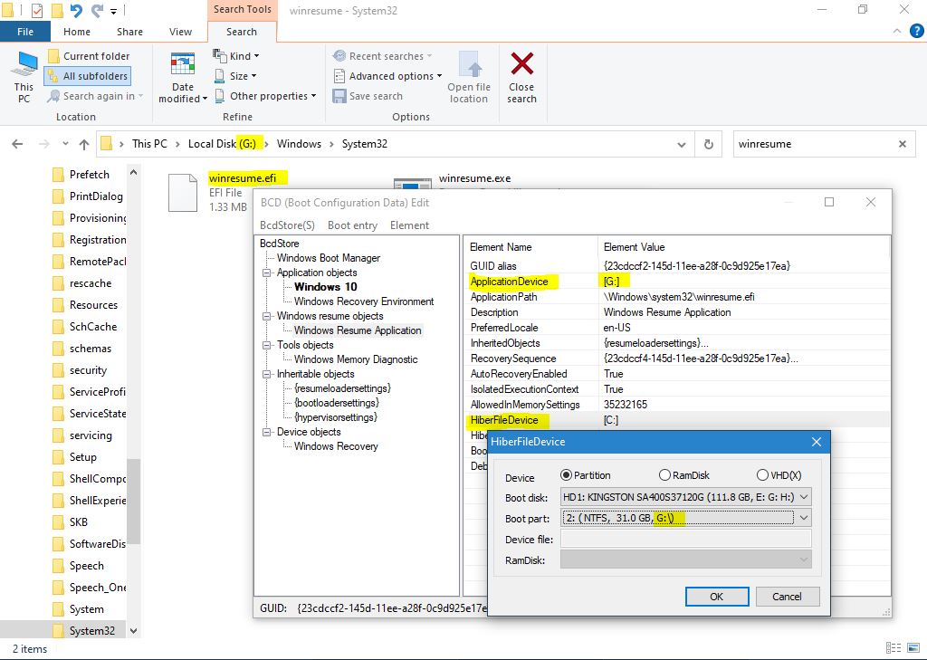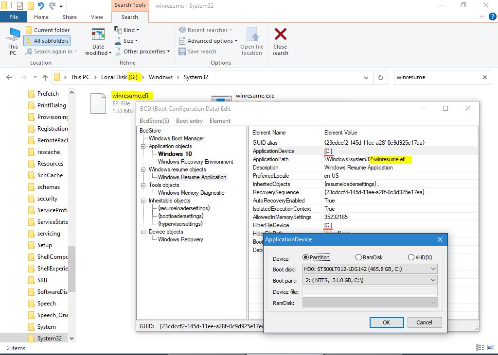 Se modifica windows resume la device si filedevice in litera paritiei de windows disk 1