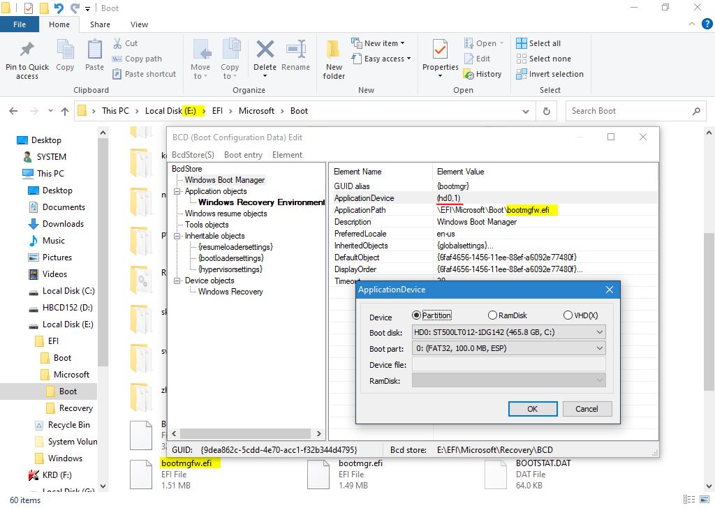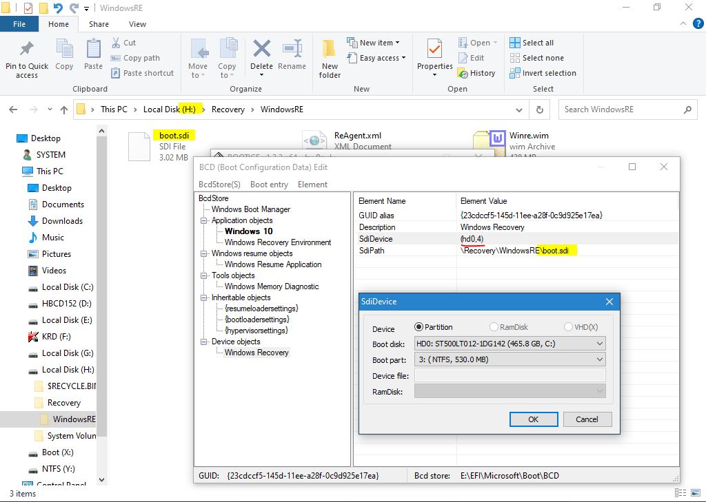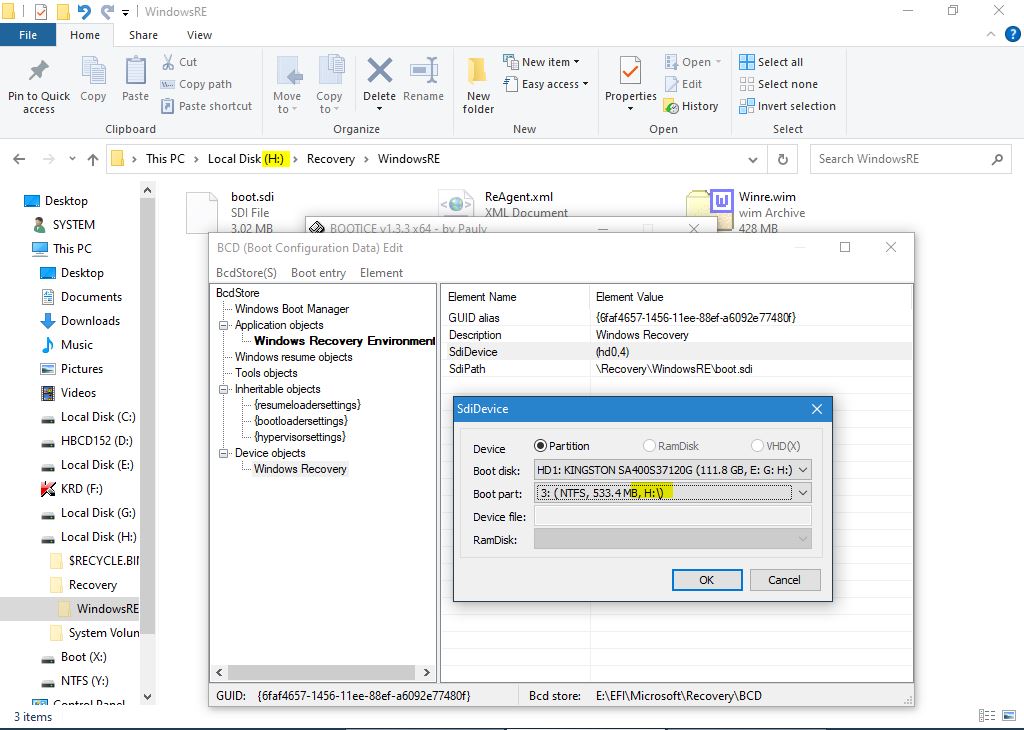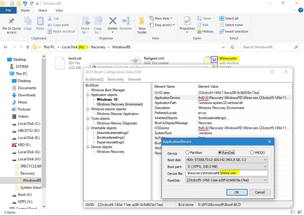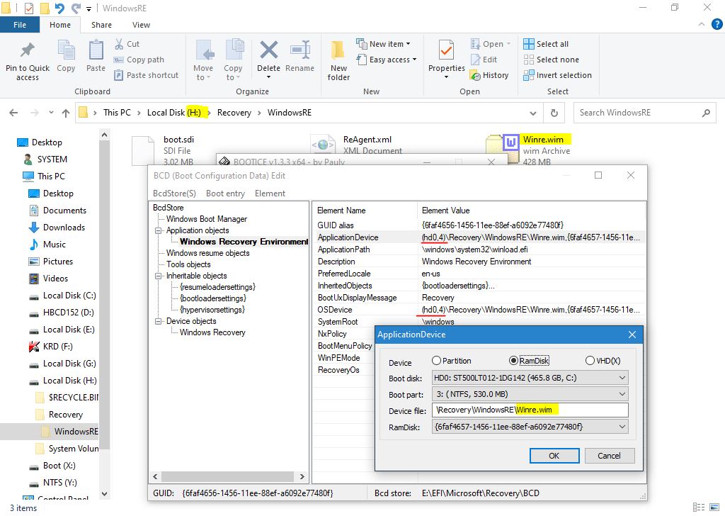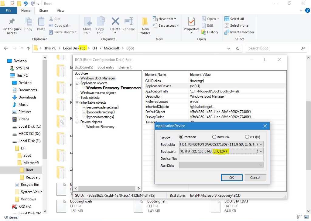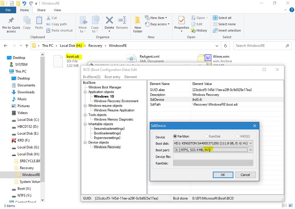 Se trece la BCD-ul de recovery in e partitia de boot in E:\EFI\Microsoft\Recovery
