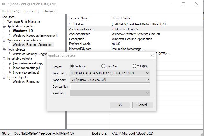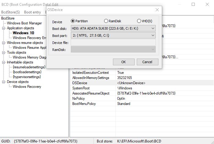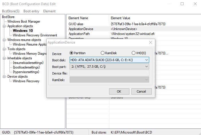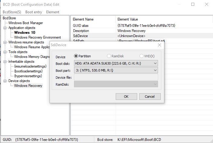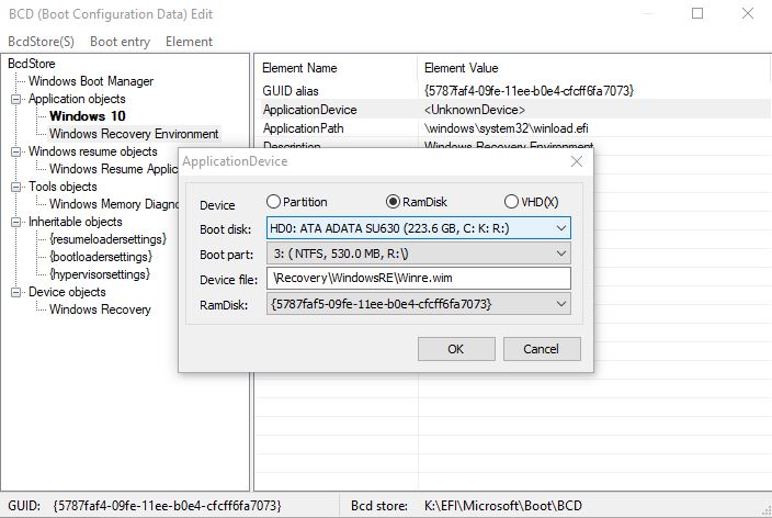 ramdisksdidevice si bootmgr , ambele cu partition=k: