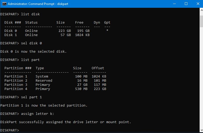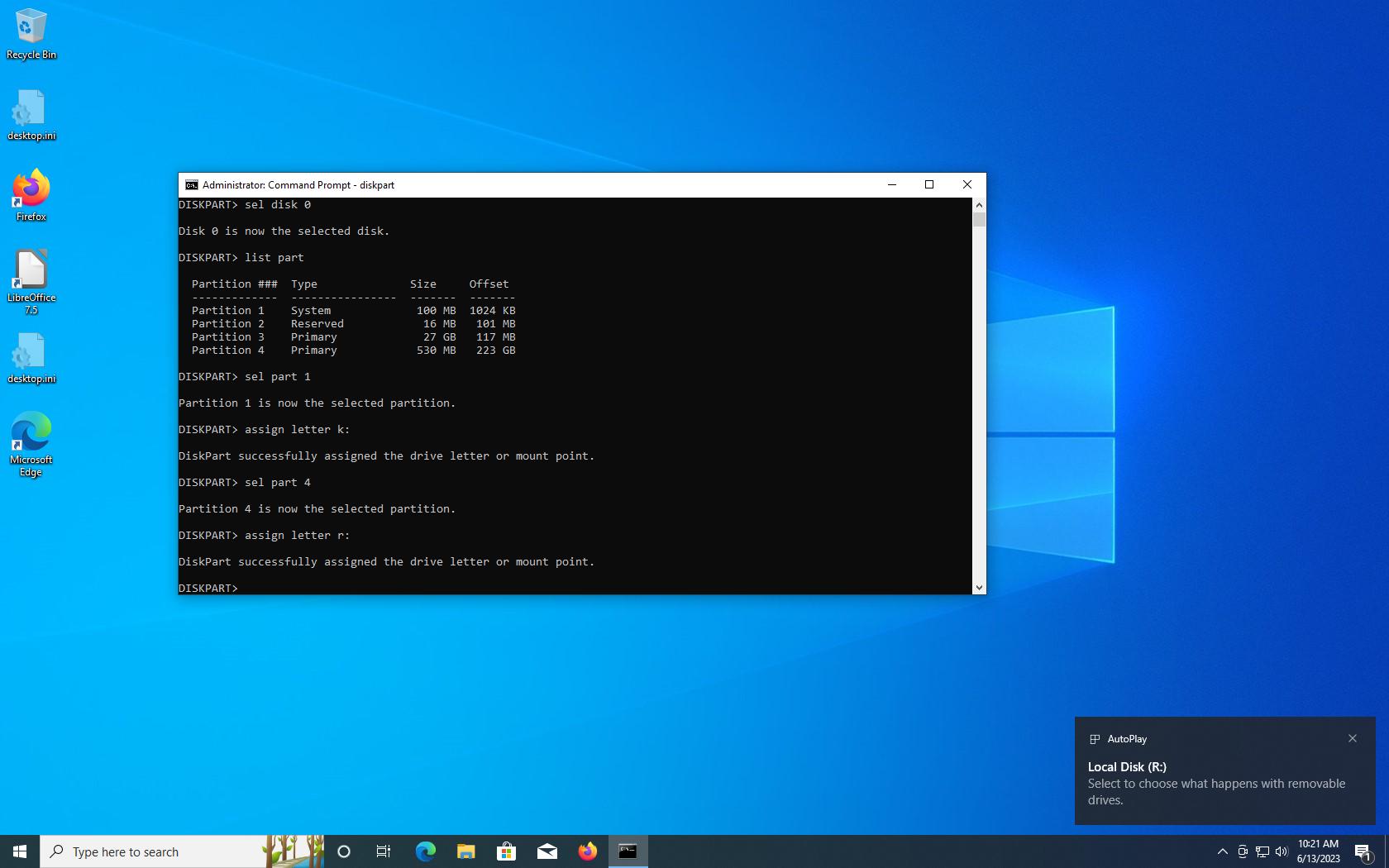 Din diskpart se asigneaza litere la partitiile de boot si recovery, eu am folosit K: si R: