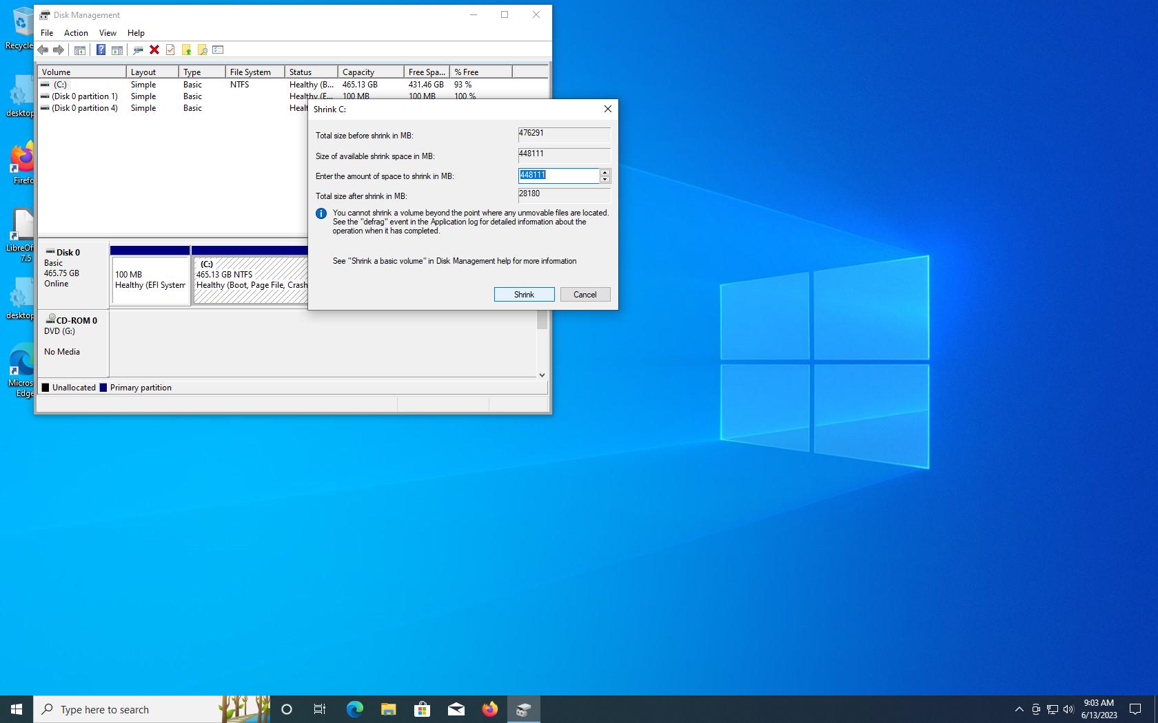 Dupa finalizarea defragmentarii din Win+x->Disk Management se face shrink la partitia de windows