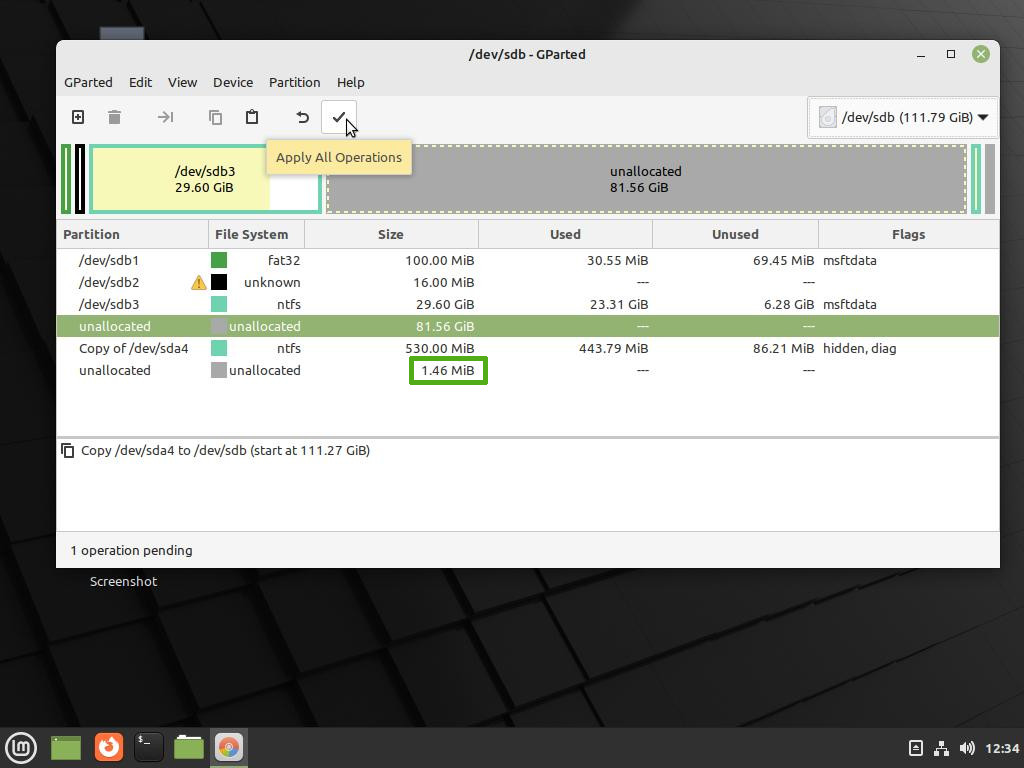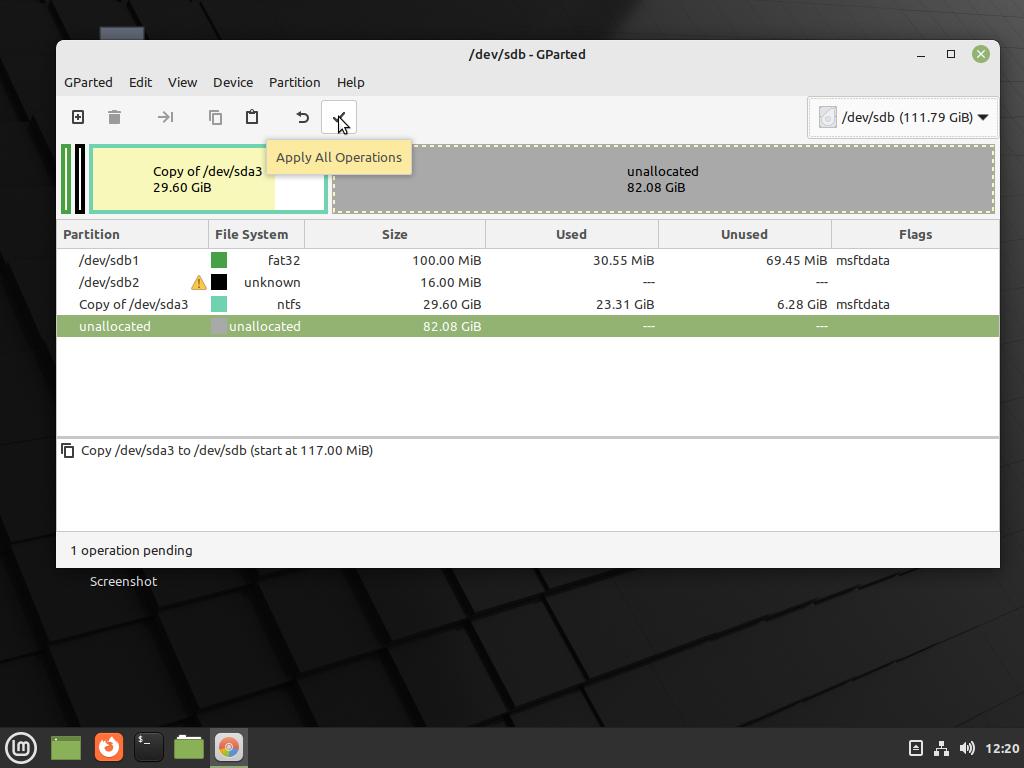 Se selecteaza partitia sursa, buton copy iar in discul target in spatiul liber se da paste si apoi buton apply