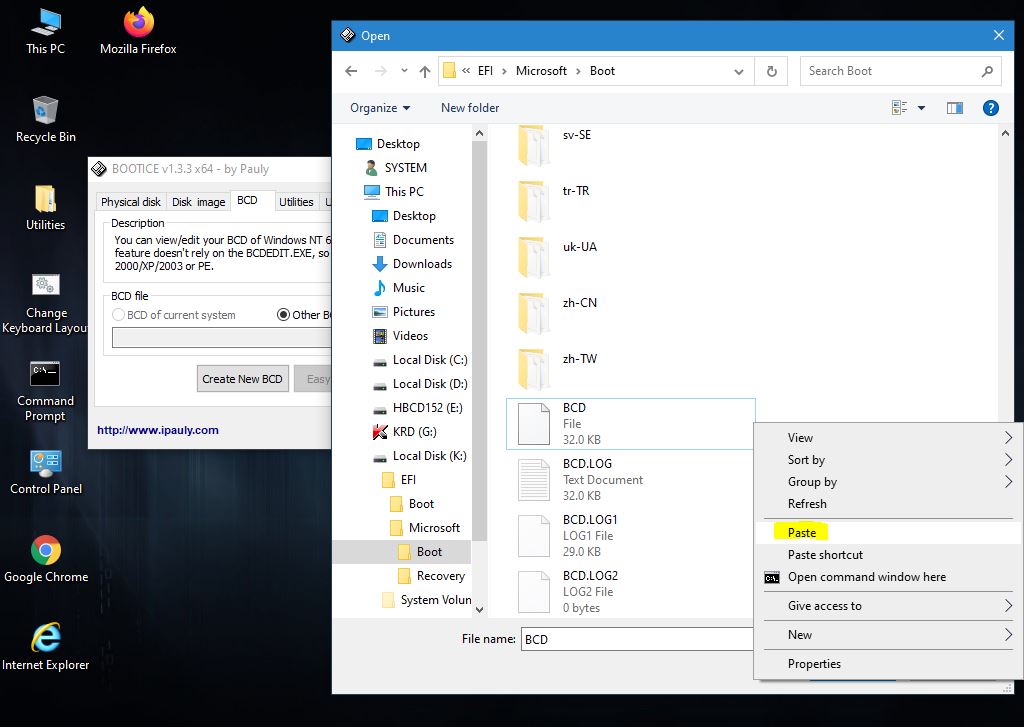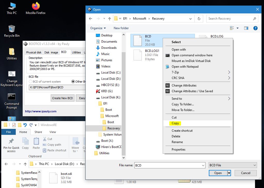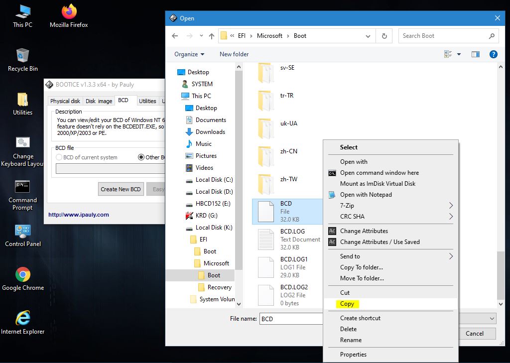 Din tab-ul BCD se face browse (cele 3 puncte orizontale) si se face backup la BCD
