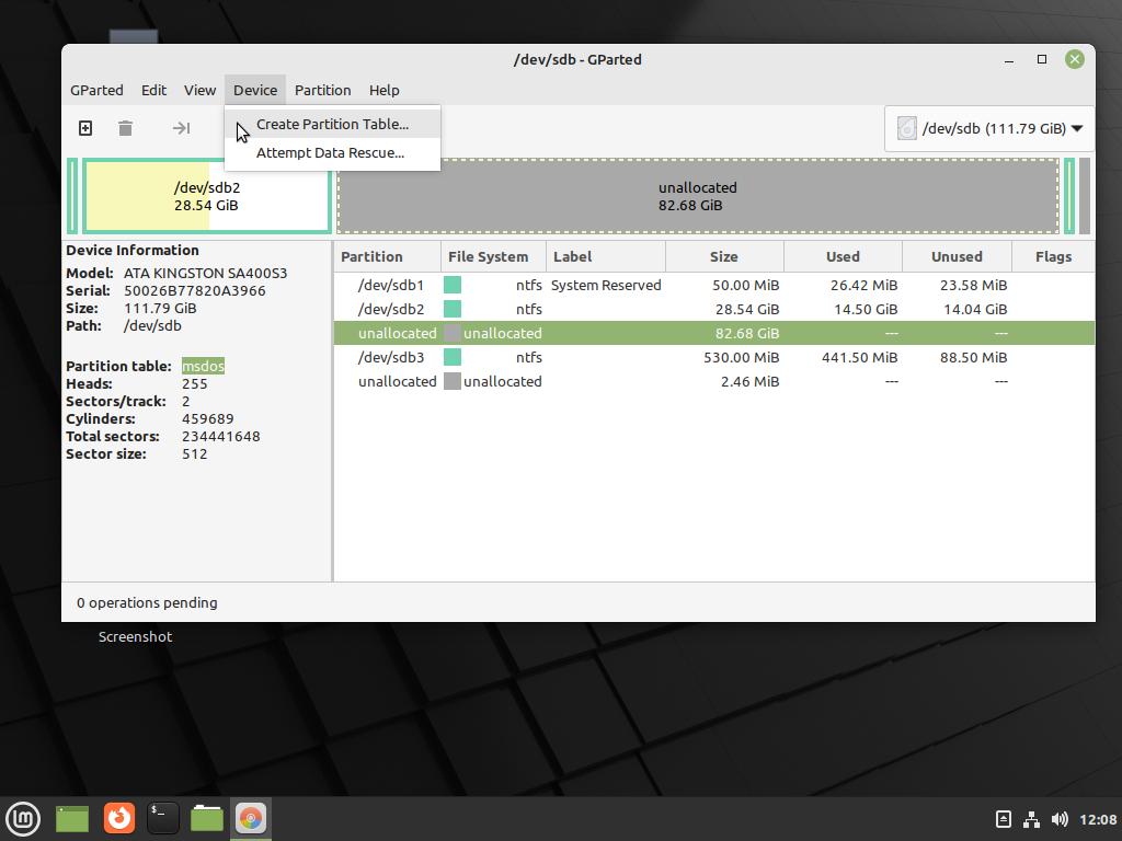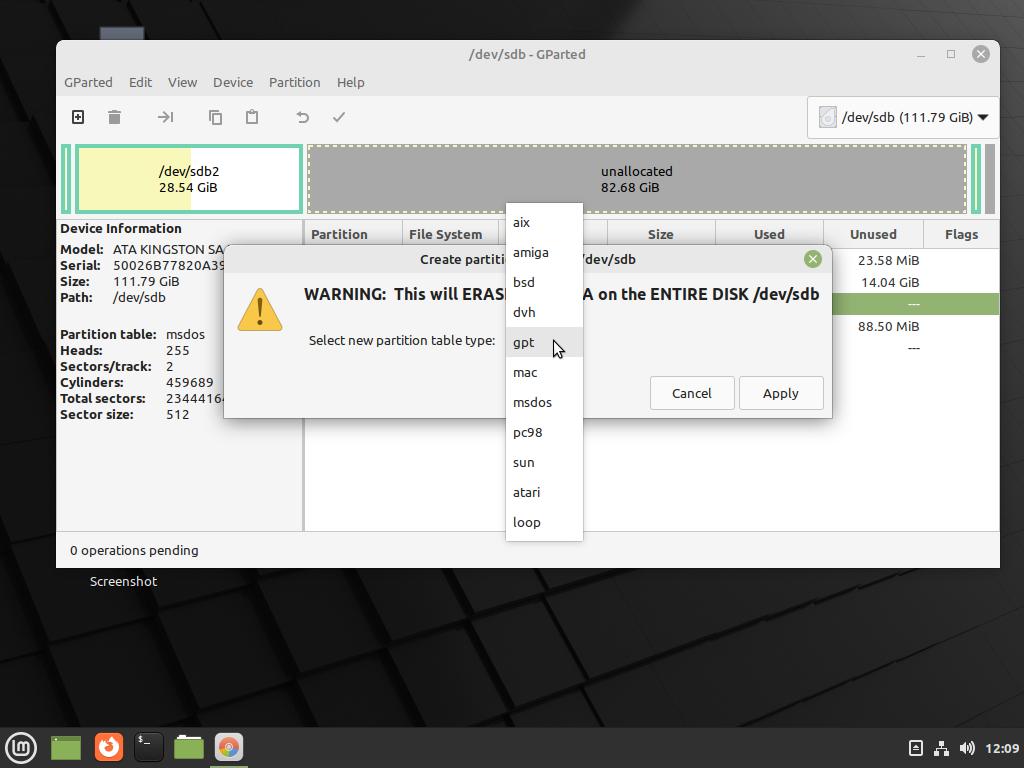 In exemplul meu ssd-ul e sdb cu msdos, se creaza partititon table pe discul target