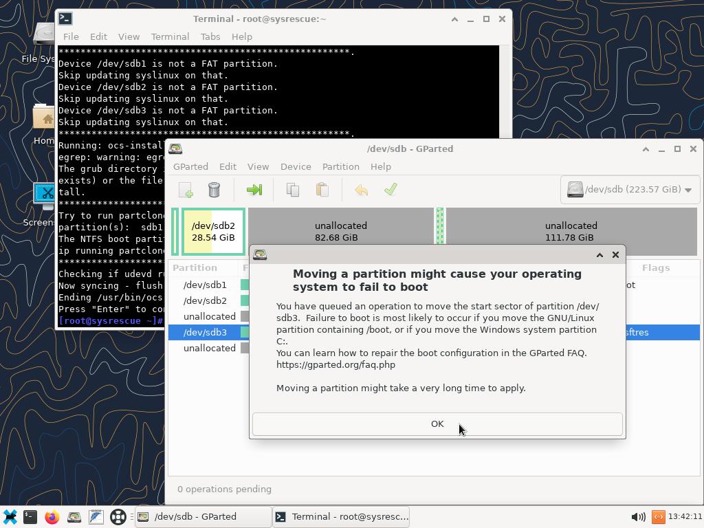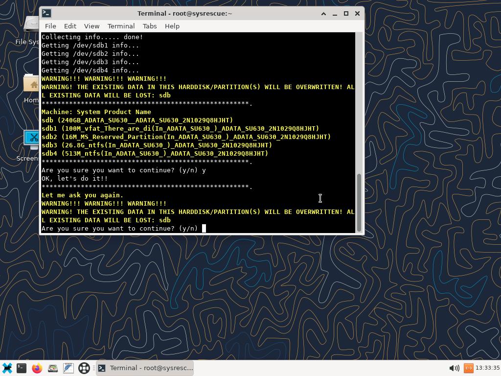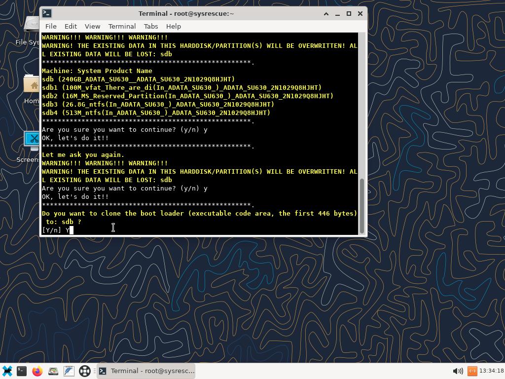 Se alege actiunea dupa clonare si se raspund cu Y la urmatoarele warning-uri in caz ca esti sigur de discul target