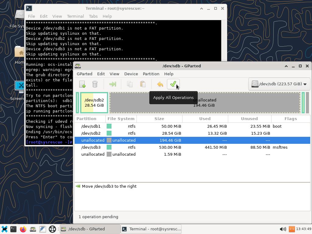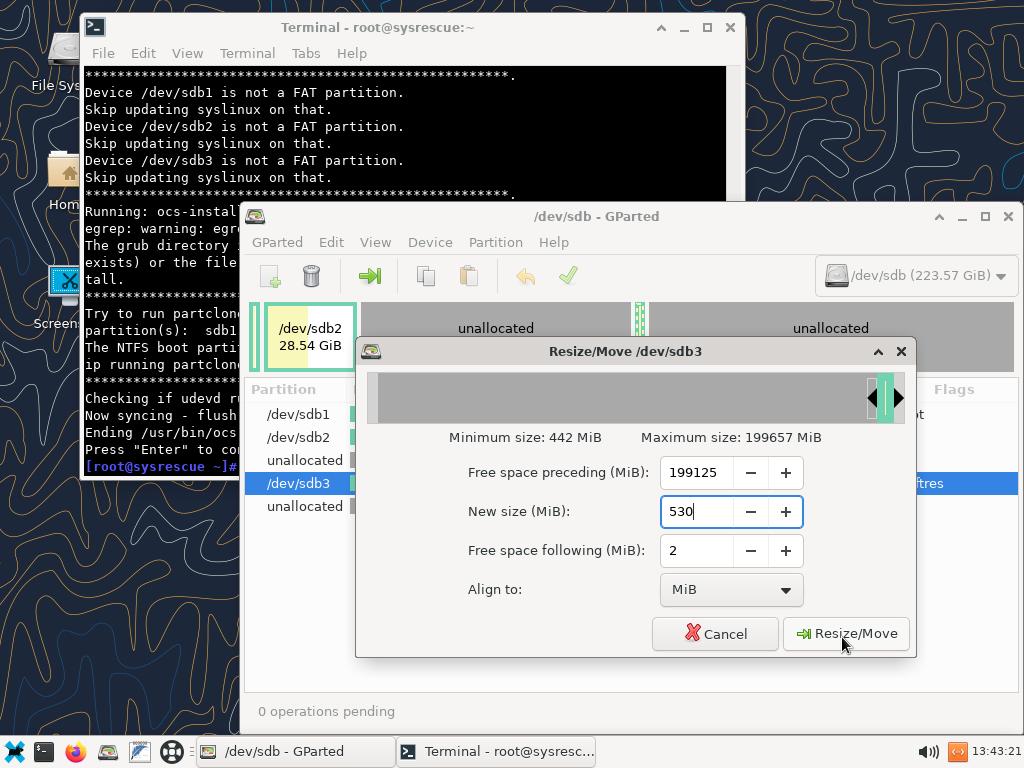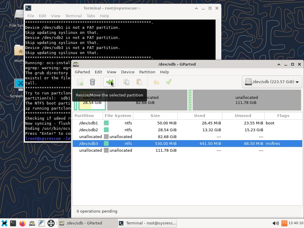 Daca se muta partitia de recovery la sfarsitul discului: se deschide Gparted si se selecteaza discul clonat