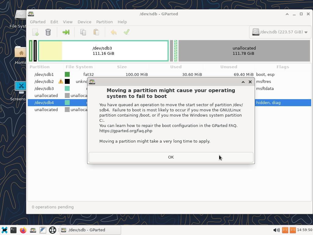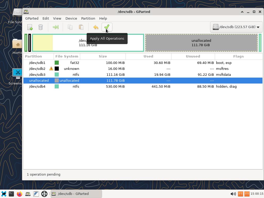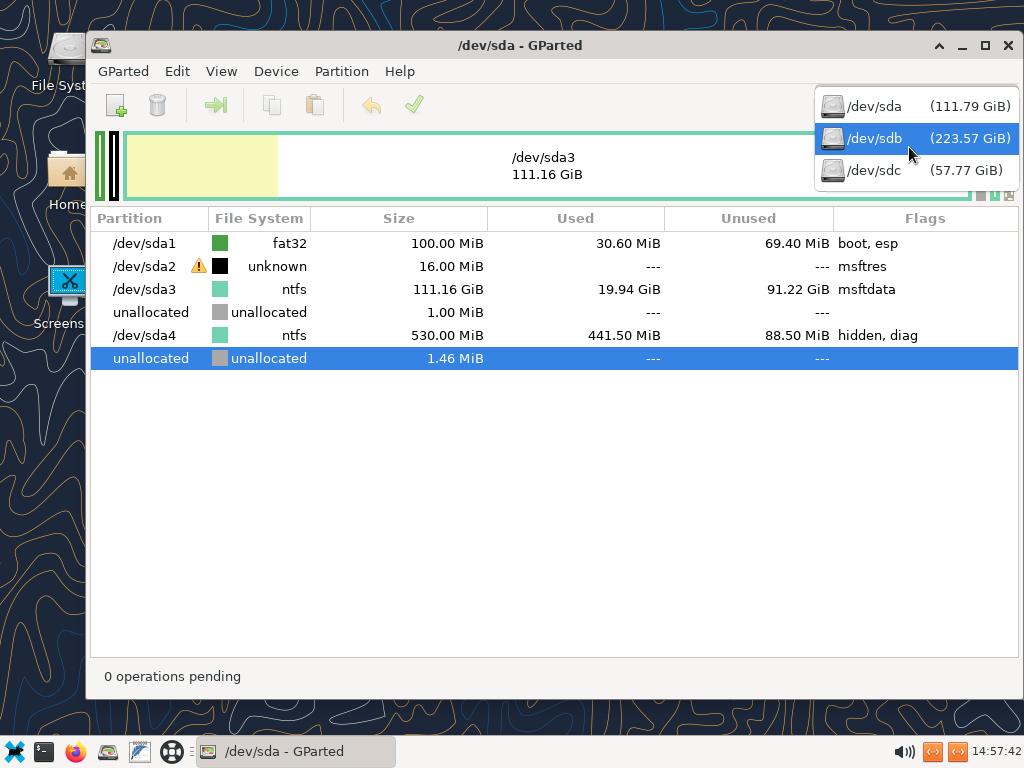 Se inchide terminalul , se deschide Gparted si se selecteaza discul clonat