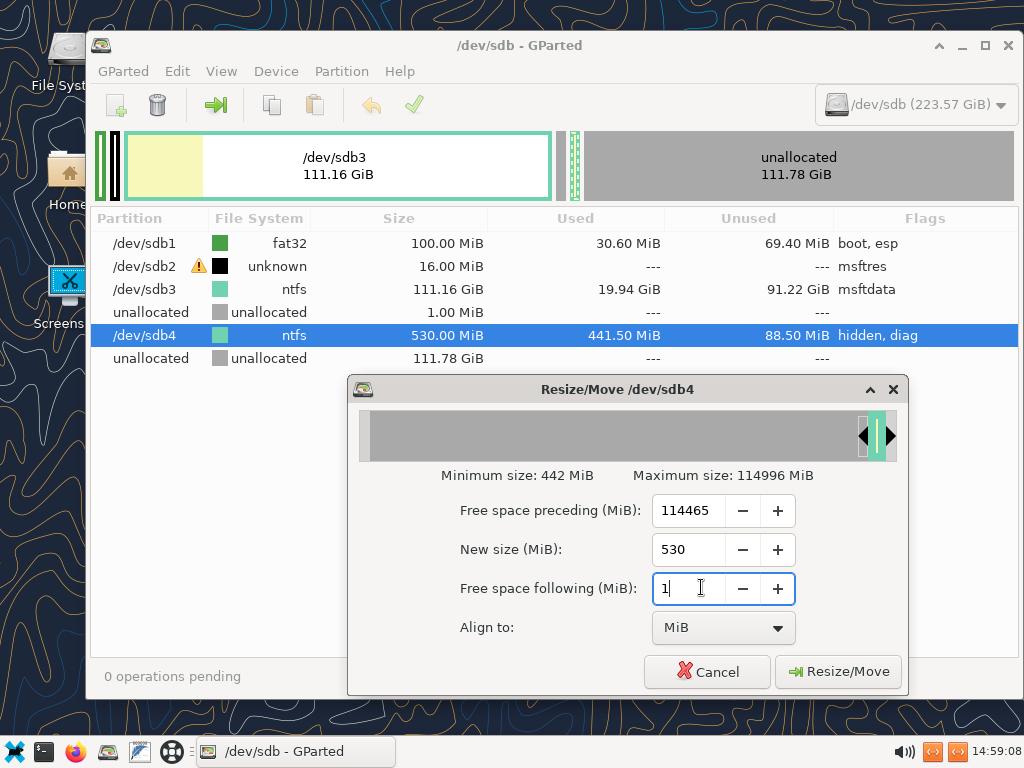 Se selecteaza ultima partitie, buton resize iar la Free space following se pune 1 si se da click pe newsize pentru recalculare valori