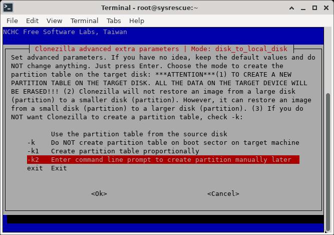 Se alege k2 la partition table si apoi se alege actiunea dupa clonare poweroff (se va scoate discul sursa)
