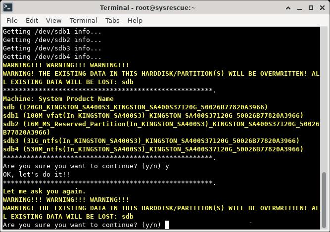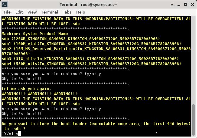 se raspund cu Y la urmatoarele warning-uri in caz ca esti sigur de discul target si la bootloader