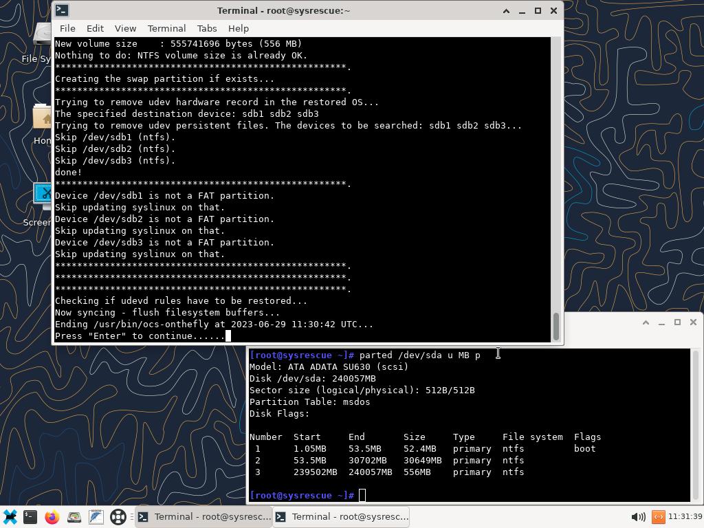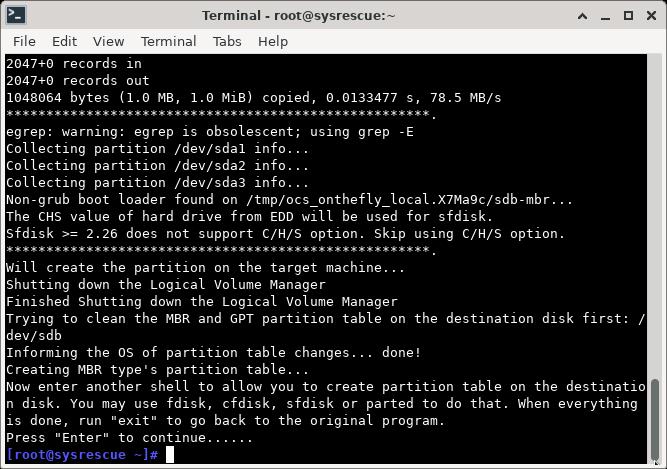 dupa exit clonezzila va continua cu fereste de status la copierea fiecarei partitii dupa finalizare se da shutdown si se scoate discul sursa