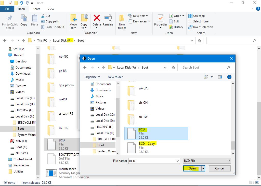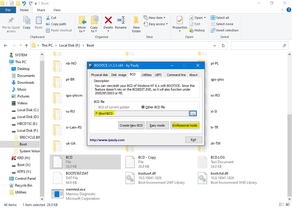 Se selecteaza fisierul BCD, se face o copie cu Ctrl+c si Ctrl+v si apoi Open, se deschide in Profesional mode