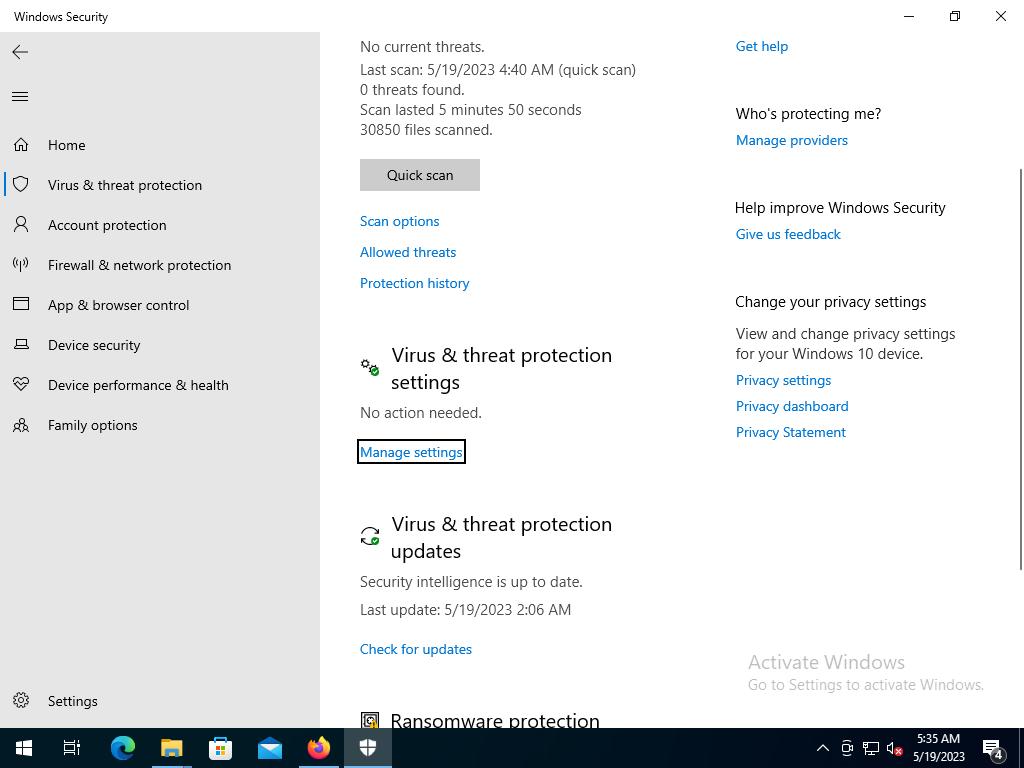 sau din Settings->Update&Security->Windows Security->Virus & threat protection