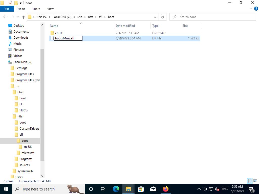 Pentru uefi se vor copia in efi/boot fisierele semnate in partitia HBCD152 cat si in partitia NTFS