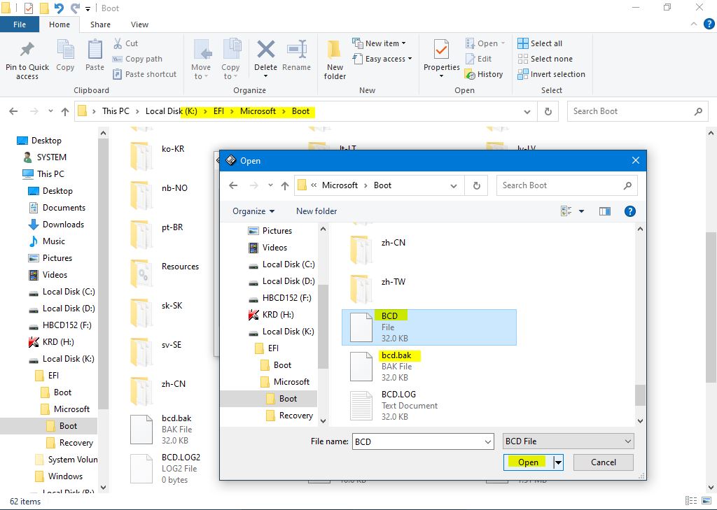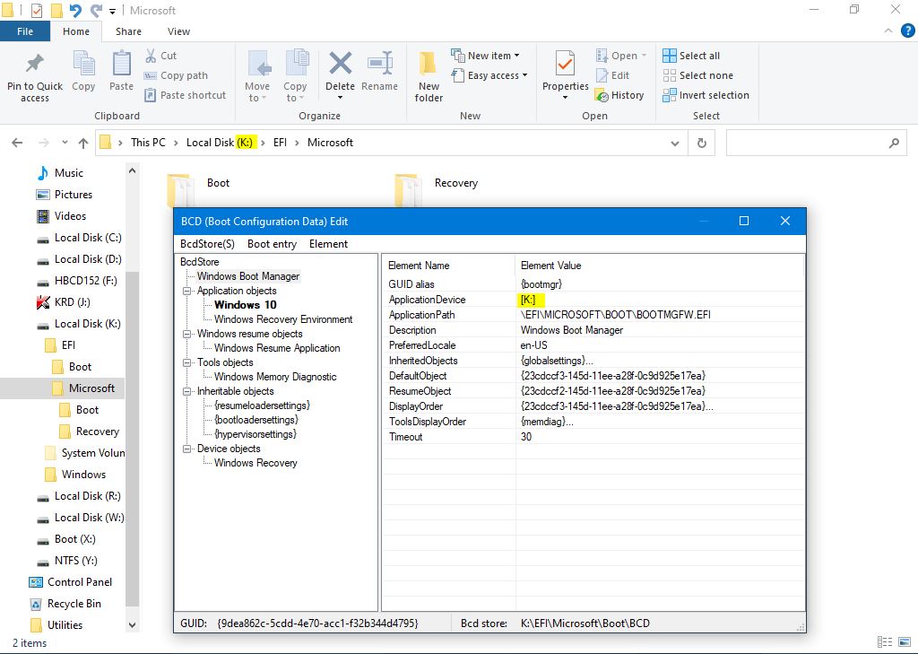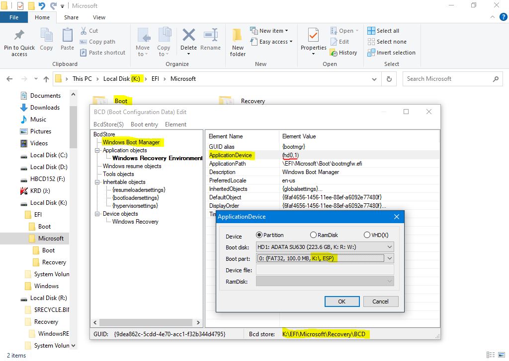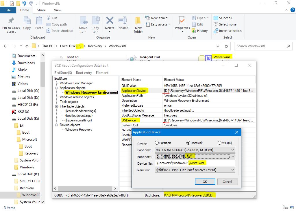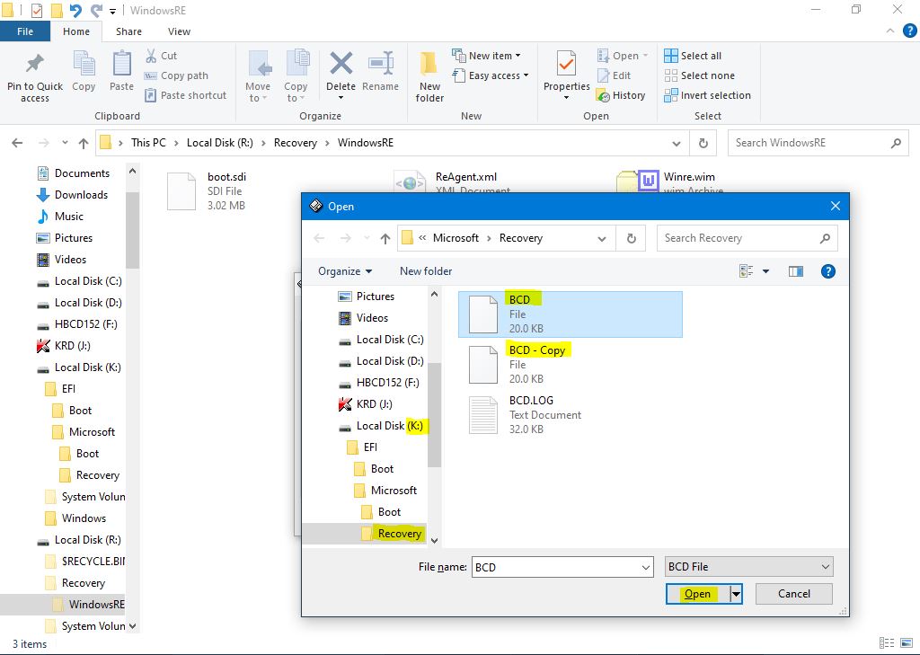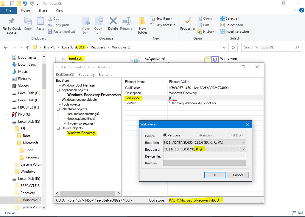 Se trece la fisierul BCD din EFI\Microsoft\Recovery, inainte de Open se face backup cu Ctrl+c si Ctrl+v
