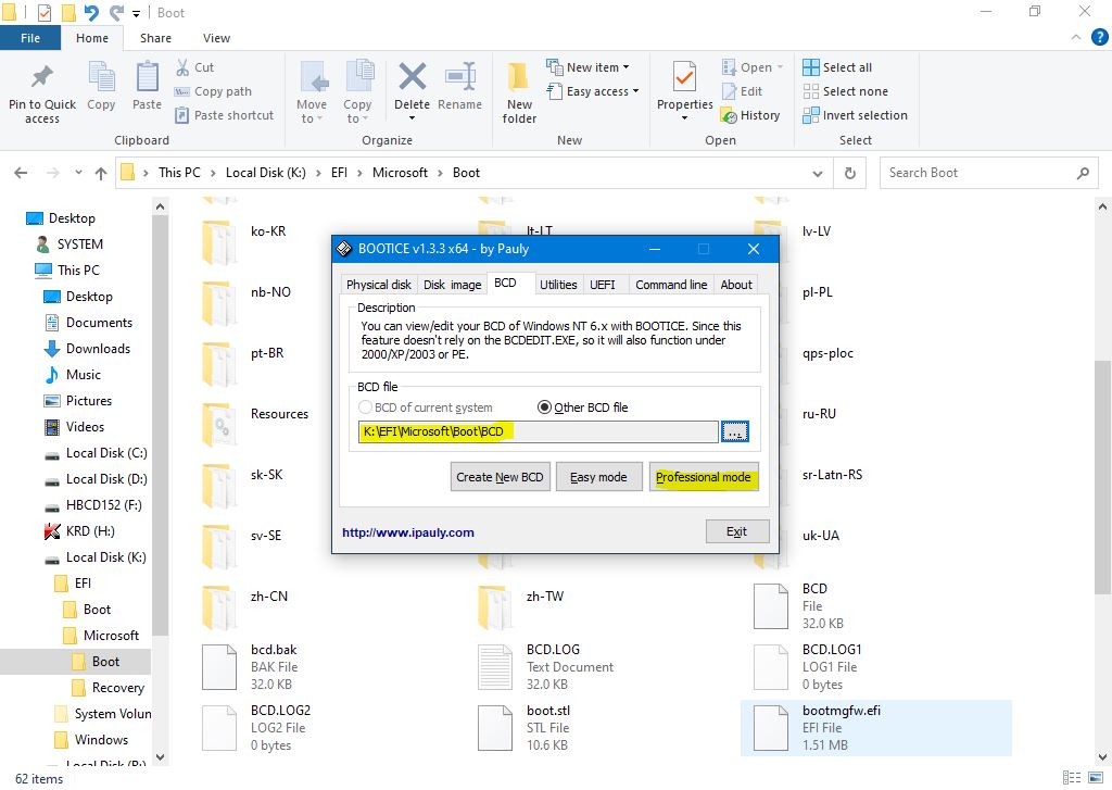 Se deschide BCD-ul din EFI\Microsoft\Boot in Profesional mode