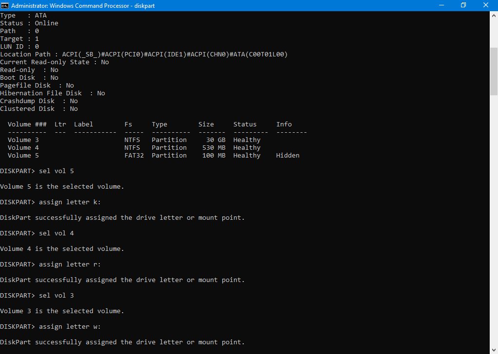 Din cmd.exe cu diskpart se dau litere la partitiile discului 1, boot K:, windows W:, recovery R: si se lanseaza BootIce