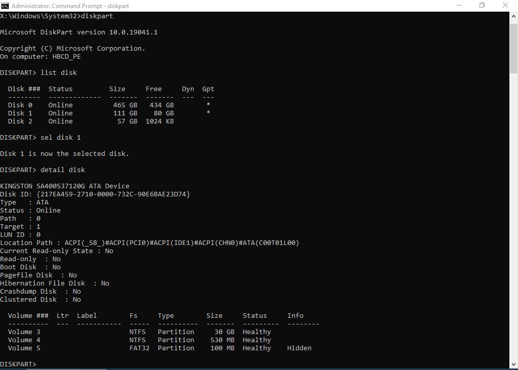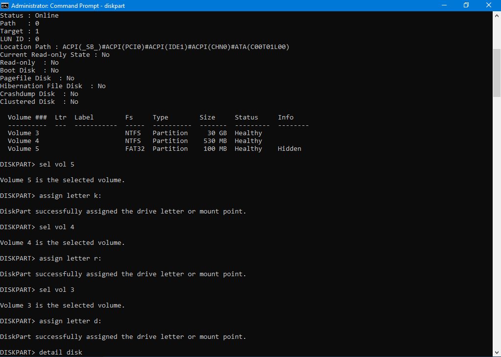 Din cmd.exe se indetifica si se dau litere la partitiile clonate