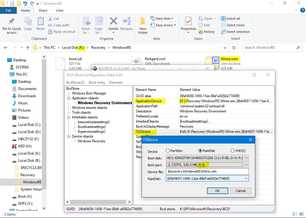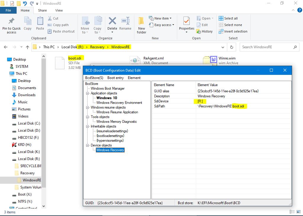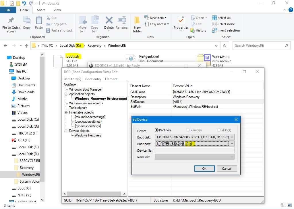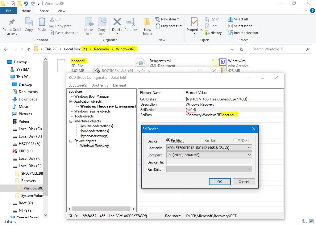 Se verifica si corecteaza toate meniurile de la boot.sdi pana la bootmgr, suntem in explorer in partitia de recovery