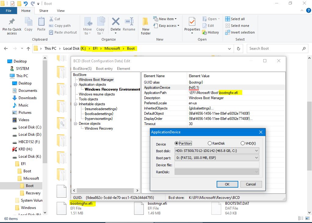 Se trece la fisierul BCD din EFI\Microsoft\Recovery